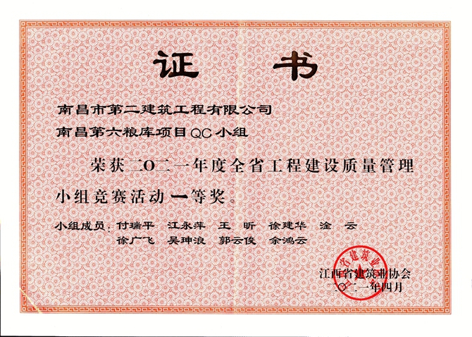 4月27日,江西省建筑業(yè)協(xié)會(huì)召開(kāi)全省建筑業(yè)全面質(zhì)量管理成果發(fā)布會(huì),我司報(bào)送參賽的南昌第六糧庫(kù)項(xiàng)目QC小組的《提高軟弱地基強(qiáng)夯施工一次驗(yàn)收合格率》QC成果和滕王閣項(xiàng)目QC小組的《提高古建砼戧梁驗(yàn)收合格率》QC成果獲得一等獎(jiǎng),繩金塔項(xiàng)目QC小組的《提高高空弧形挑檐施工質(zhì)量》QC成果獲得二等獎(jiǎng),為促進(jìn)企業(yè)技術(shù)創(chuàng)新和科技進(jìn)步、提升企業(yè)品牌形象添勁加力。
