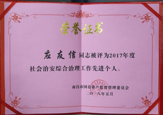 公司社會治安綜合治理和信訪工作榮獲國資委2017年度先進單位,陳國明、應友信同志榮獲國資委2017年度先進個人稱號。