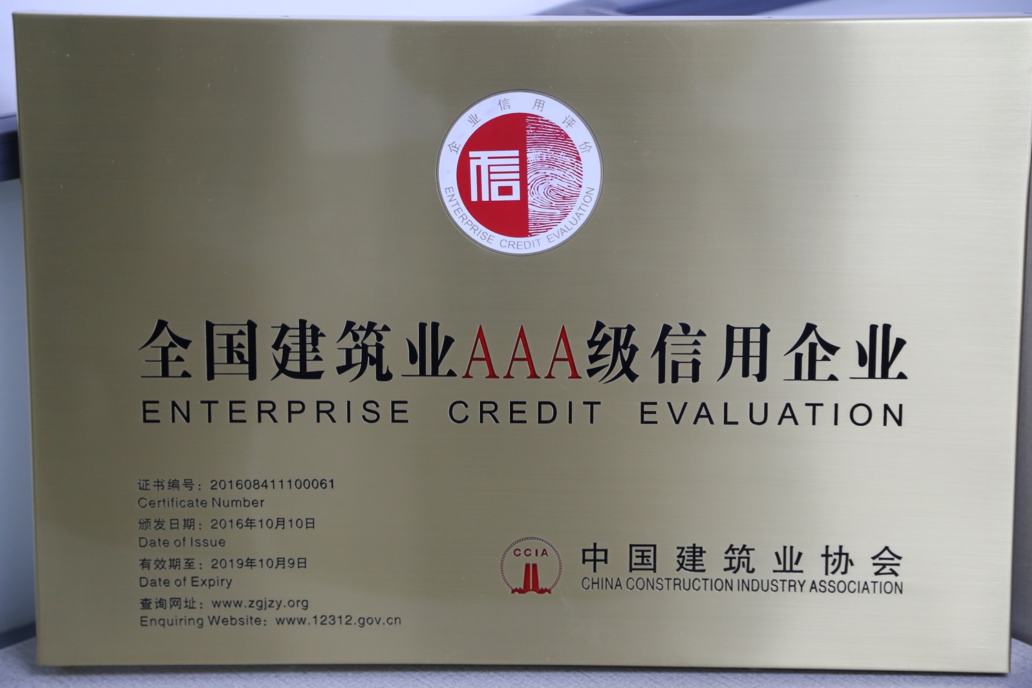 企業(yè)信用等級是由中國建筑業(yè)協會經審核、篩選和評定而確定的,有效期3年,每年復審一次。由于公司一直本著誠信、服務、質量為上的原則,獲得了中國建筑業(yè)協會及社會大眾的認可,2016年10月公司再度榮獲“AAA級信用企業(yè)”的榮譽稱號。這個全國建筑行業(yè)都為數不多的榮譽是對我們企業(yè)的肯定及嘉獎,讓我們樹起信譽旗幟,再創(chuàng)輝煌,攜手走得更好、更遠。