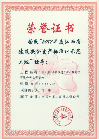 公司承建的郭家莊地塊棚戶區(qū)改造項(xiàng)目(安置房)工程、匠人聚.南昌市建筑設(shè)計(jì)研究院有限公司總部基地榮獲2017年度江西省建筑安全生產(chǎn)標(biāo)準(zhǔn)化示范工地稱(chēng)號(hào)。
